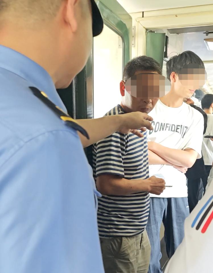 ▲列车长劝阻在车厢连接处吸烟的乘客 受访者供图