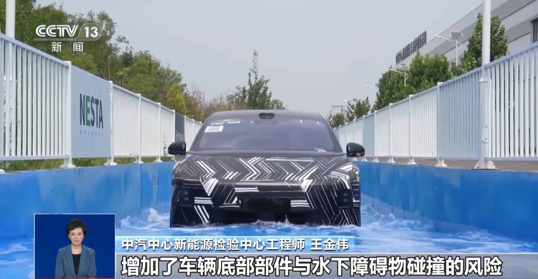 中汽中心新能源检验中心 工程师 王金伟:夏季道路积水会影响驾驶人员对路面状况的准确判断,增加车辆底部部件与水下障碍物碰撞的风险,给行车安全带来隐患。如涉水区颠簸行驶测试,就是模拟路面的坑洼、扭曲,重点验证电池系统在动态工况下的防水密封能力。