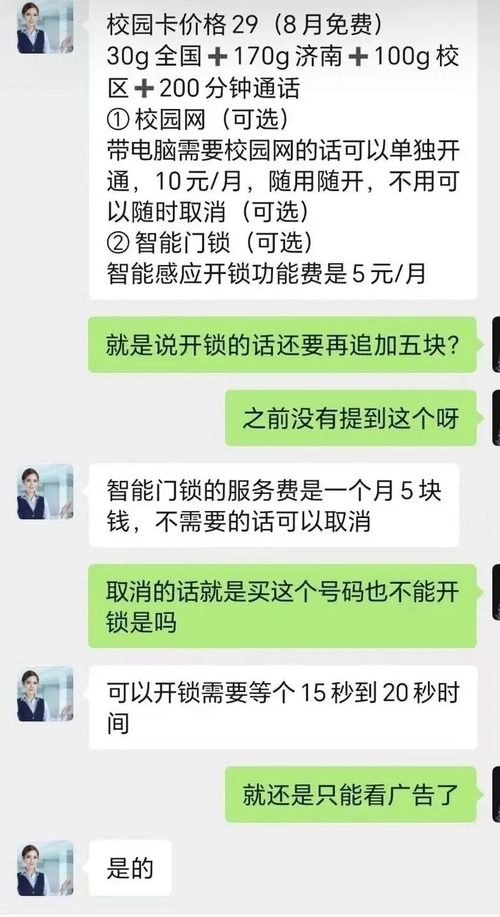 记者采访中发现,引发学生们质疑的说法主要源于网传的学生与办理SIM卡校园网工作人员的聊天记录。该聊天记录显示,有自称SIM卡办理的相关工作人员表示,“智能门锁服务费是一个月5元,不办理就要扫码看广告开门。”