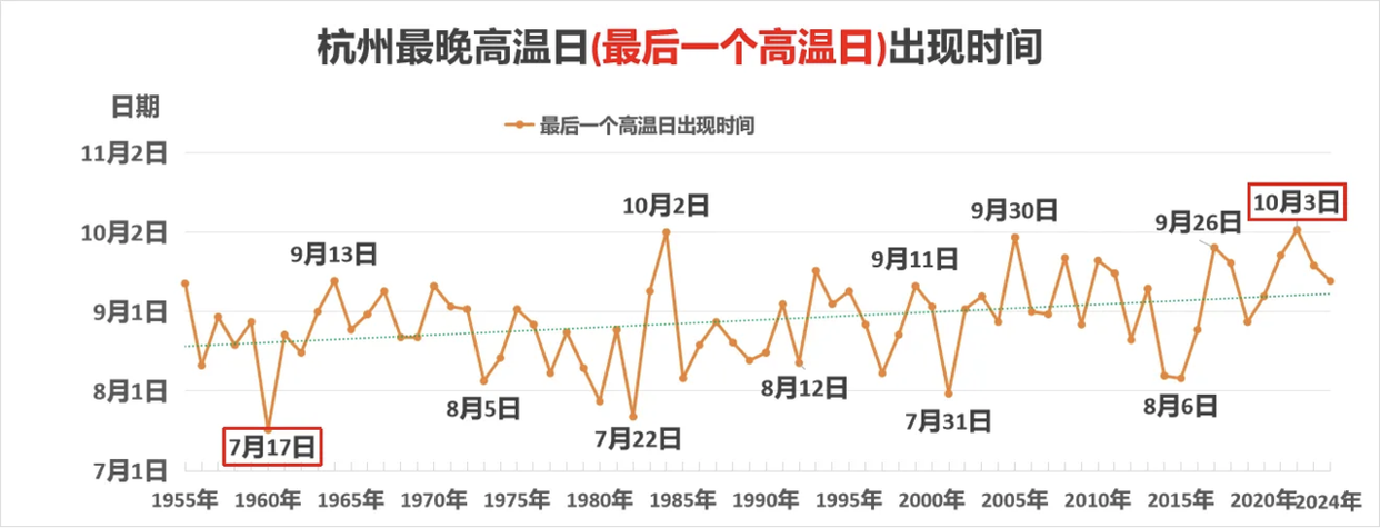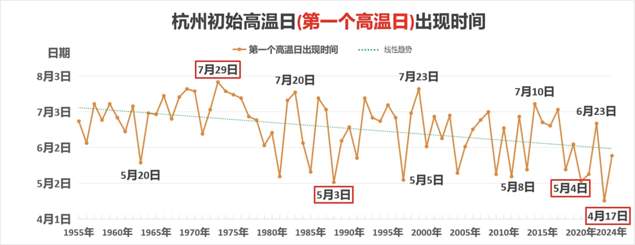 除了“更热”,杭州的夏天还在悄悄“拉长”。数据印证了不少人的感受:高温来得越来越早,走得越来越晚。从高温“开场时间”看,杭州年平均首个高温日为6月19日,但2023年的首个高温日提前到了4月17日,比平均值早了两个多月;而1973年的首个高温日则迟到了7月29日,两者相差近100天。