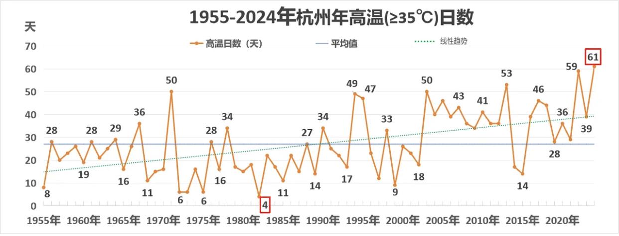 杭州的高温日数正以肉眼可见的速度增加,呈线性上升趋势,但年际波动大。数据显示,1955-2024年,杭州年平均高温日数为27天,但年际差异悬殊——最热的2024年,高温日数飙到了61天,创下70年以来的最高纪录;而最冷的1982年,全年仅4天。