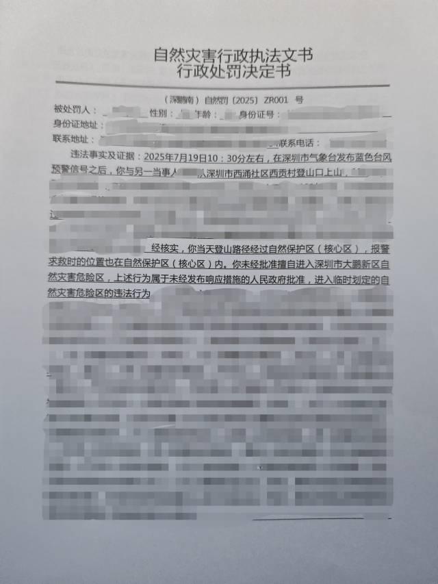 8月15日,大鹏新区应急管理局指导南澳办事处依据《深圳经济特区自然灾害防治条例》,对两名游客处以每人5000元罚款。