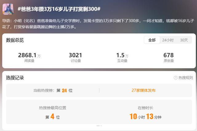 近日,河南16岁男孩小明(化名)花掉学费打赏“擦边主播”,引发关注。#爸爸3年攒3万16岁儿子打赏剩300# 登上微博热搜第4位。