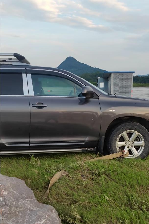 桃花岛心黑色SUV车轮与一块石头绑在一起防冲走