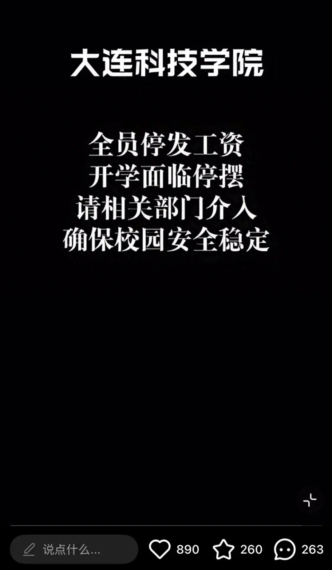 8月23日,记者以家长身份致电大连科技学院求证此事,学校院办工作人员证实网传的《致全体教职员工一封信》内容属实,但表示“现在学校已经在解决这个问题了,政府不可能让学校停止运行,我们老师马上都上班了。”同日,记者致电该校主管部门辽宁省教育厅,电话无人接听。