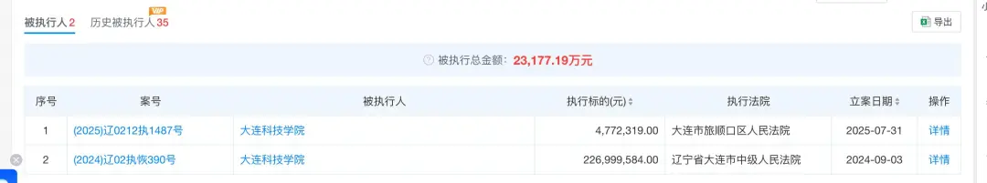 记者注意到,《致全体教职员工一封信》的落款时间为8月5日。根据天眼查信息显示,大连科技学院共有2条被执行人信息,被执行总金额超2.3亿元;共有35条历史被执行人信息,被执行总金额超35亿元。其中,8月4日新增1则恢复执行信息,执行标的超1.3亿元,执行法院为辽宁省大连市中级人民法院。