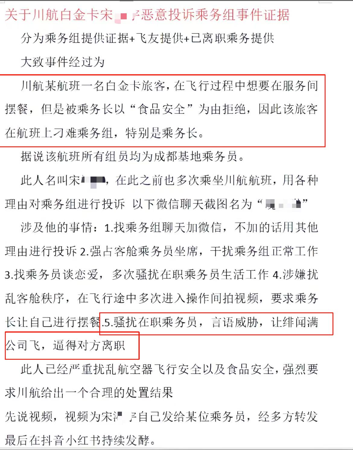 8月24日,潇湘晨报记者注意到,网络流传该白金卡乘客相关信息,称该男子多次找乘务组聊天添加微信,如不通过微信好友申请,会进行投诉,网友晒出该聊天记录称是该男子为川航“摆餐”事件当事人。此之前也多次乘坐川航航班,用各种理由对乘务组进行投诉,冰骚扰在职乘务员,逼得对方离职。