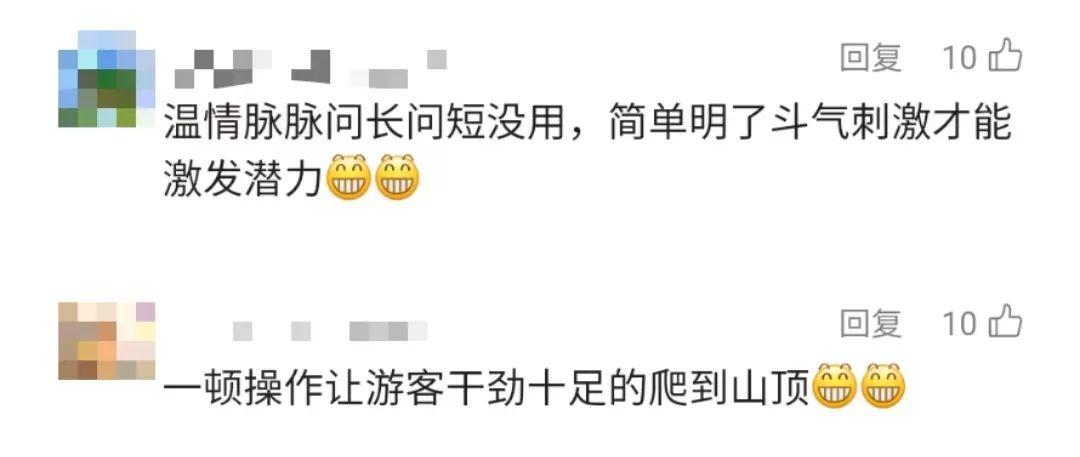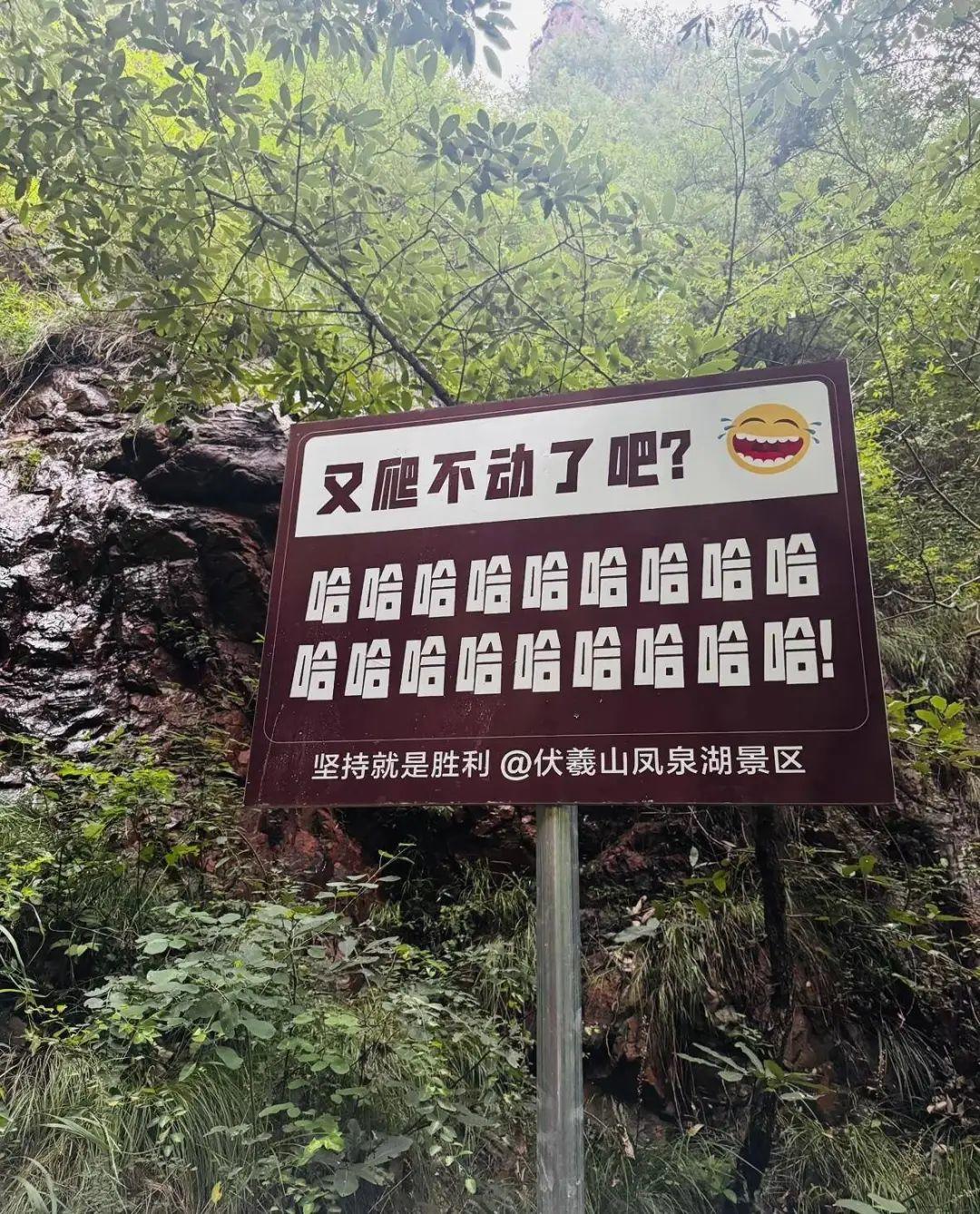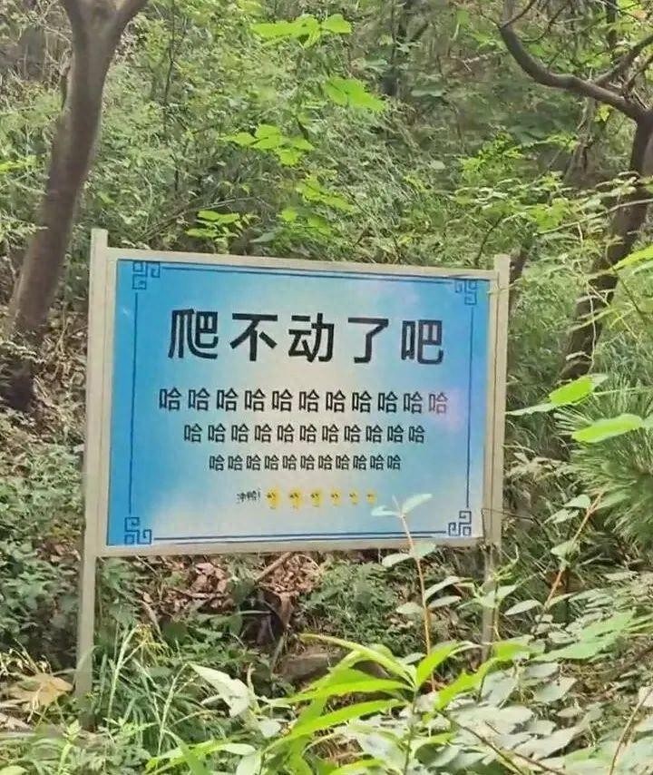 网友在帖子中贴出景区的指示牌标语,其中有“爬不动了吧,哈哈哈哈哈”“爬不动了吧,保持微笑,你可是花了钱的”“加油,别担心,还有三万步,你现在在想什么,是不是特别想回家找妈妈”等。