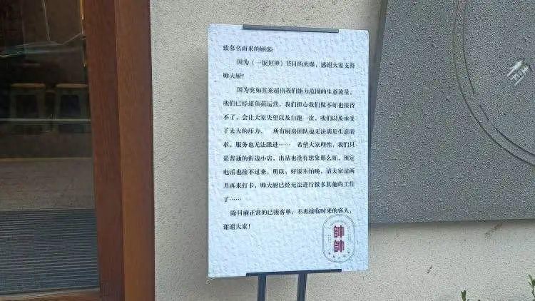 近日,位于长乐路的“帅帅精致家常味”张贴出告示,表示因为《一饭封神》节目的火爆,突如其来的生意流量超出餐厅能力范围,餐厅目前已经超负荷运营,考虑到厨房团队无法满足生意需求,服务也无法跟进;所以,除目前正常的已接客单,餐厅不再接临时来的客人。