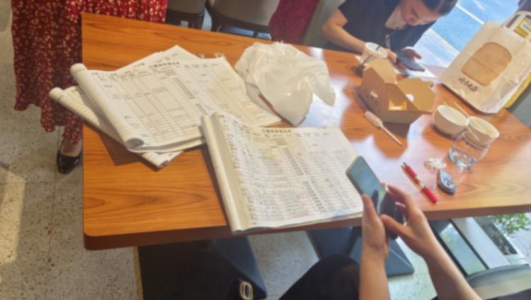桌上有几本厚厚的订餐预定记录本,上面密密麻麻写满了顾客的预约信息,两位员工正在忙着进行登记,一位员工的手机一刻不停在接听来电。
