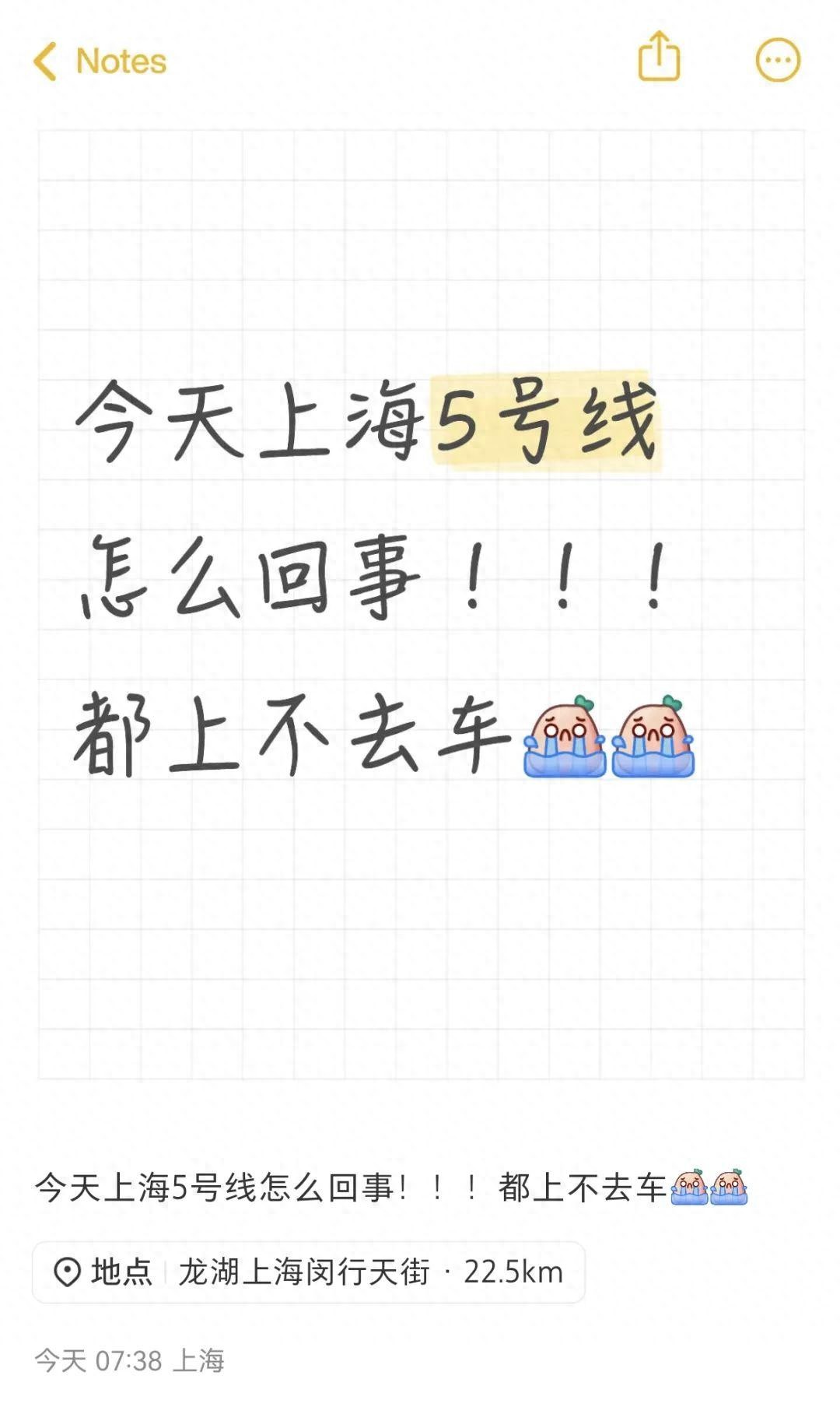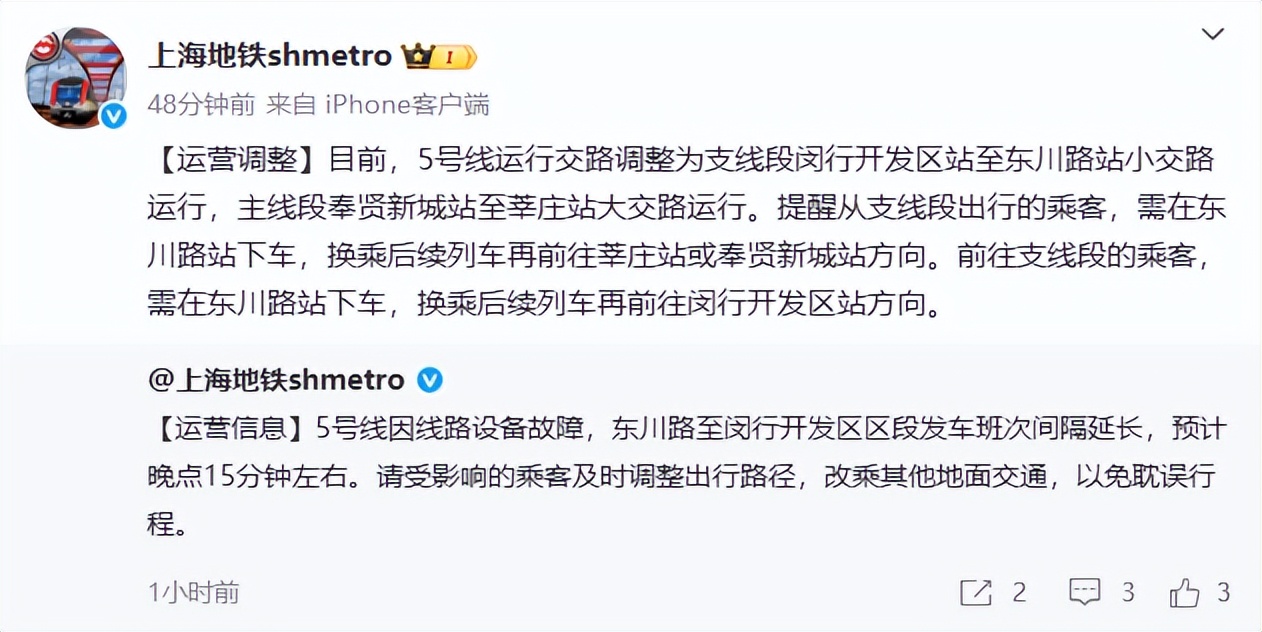 8月25日5时18分,@上海地铁shmetro 发布运营信息:5号线因线路设备故障,东川路至闵行开发区区段发车班次间隔延长,预计晚点15分钟左右。请受影响的乘客及时调整出行路径,改乘其他地面交通,以免耽误行程。