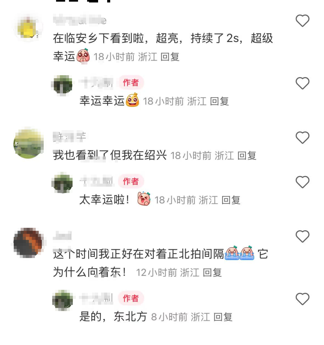 陈女士说,当晚她和家人从衢州观看演唱会返杭途中突然看到一道光弧。“速度不算特别快,但明显比飞机快,带着偏红色的尾光,非常壮观。”由于时间较晚,加上演唱会现场刚看过无人机模拟的流星表演,她一度怀疑是错觉。直到在最近的服务区停下回看行车记录仪,才确认这是一颗真实的火流星。