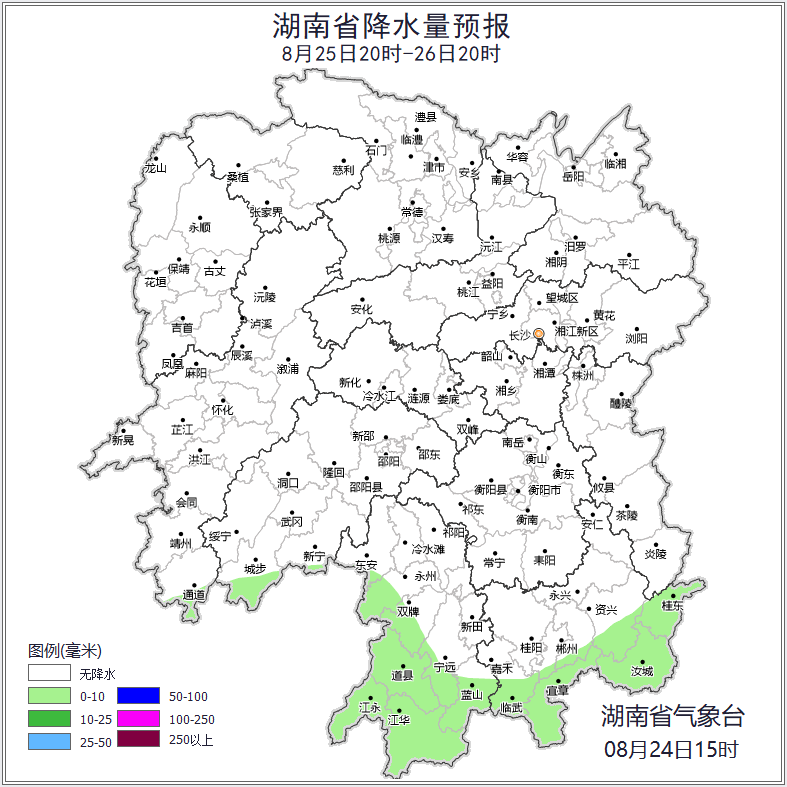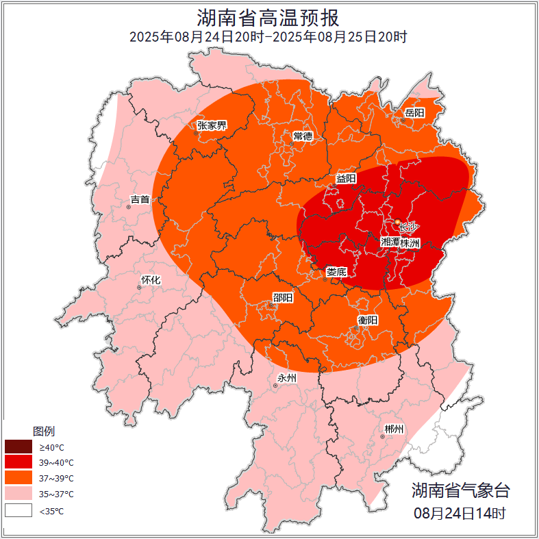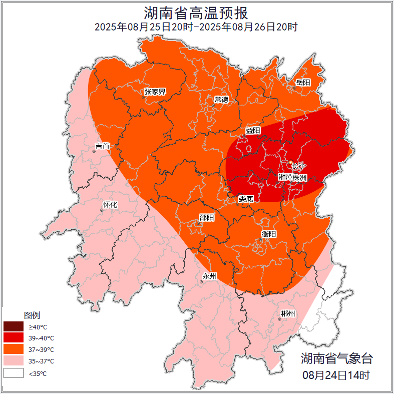 预计25日白天,湘中、湘北部分地区将达到37℃以上高温,其中岳阳南部、益阳中部、长沙、湘潭、株洲北部局地将达39℃以上,请做好防范。