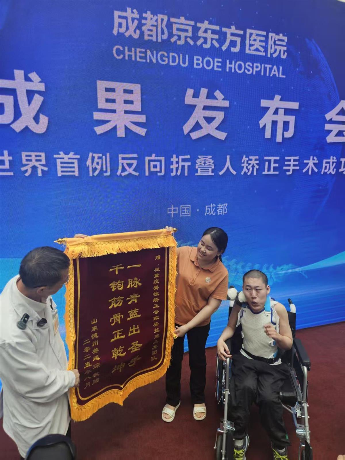从去年12月到今年6月,山东00后“折叠男孩”姜延琛经历四次手术后,身体终于被“打开”。8月25日下午,成都京东方医院举行了“世界首例反向折叠人矫正手术成果发布会”,发布会上,姜延琛依靠辅助器具自行站立并短暂行走。