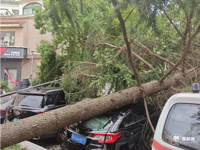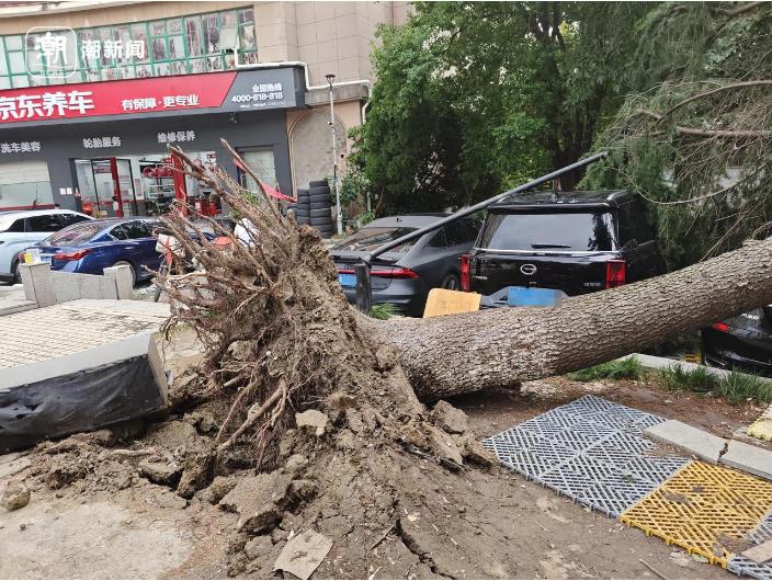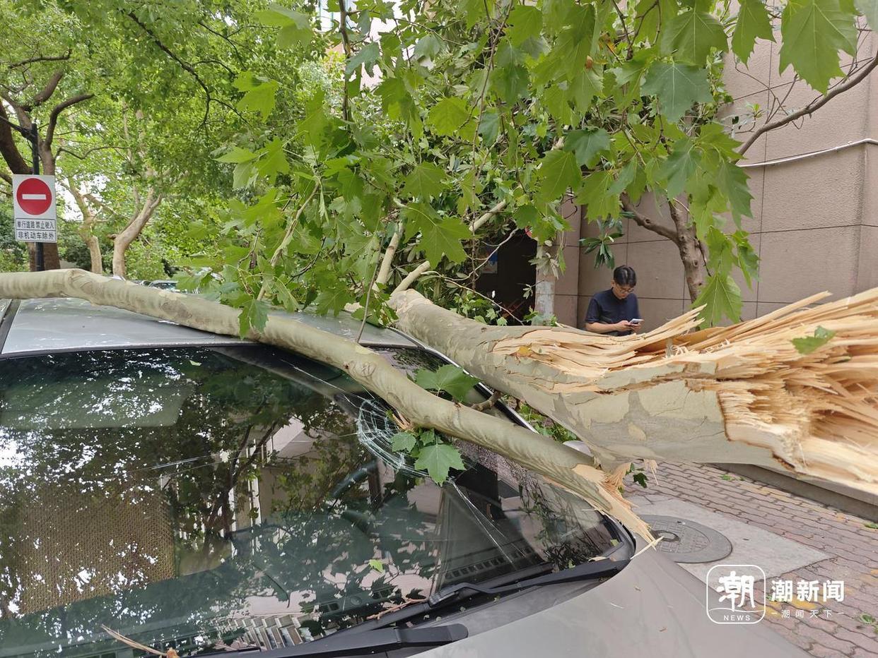 不远处的三塘高层公寓前的小广场,也有多棵树木倒伏或断枝,其中一棵松树被连根拔起,压住了停在树下的几辆车,其中一辆suv受损比较严重,整个后挡风玻璃都碎了。