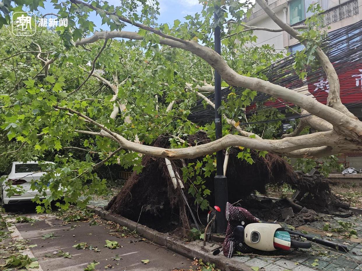 潮记者赶到现场。事发地点位于香积寺路附近的碧桃巷,沿路有不少被拦腰折断的树枝。