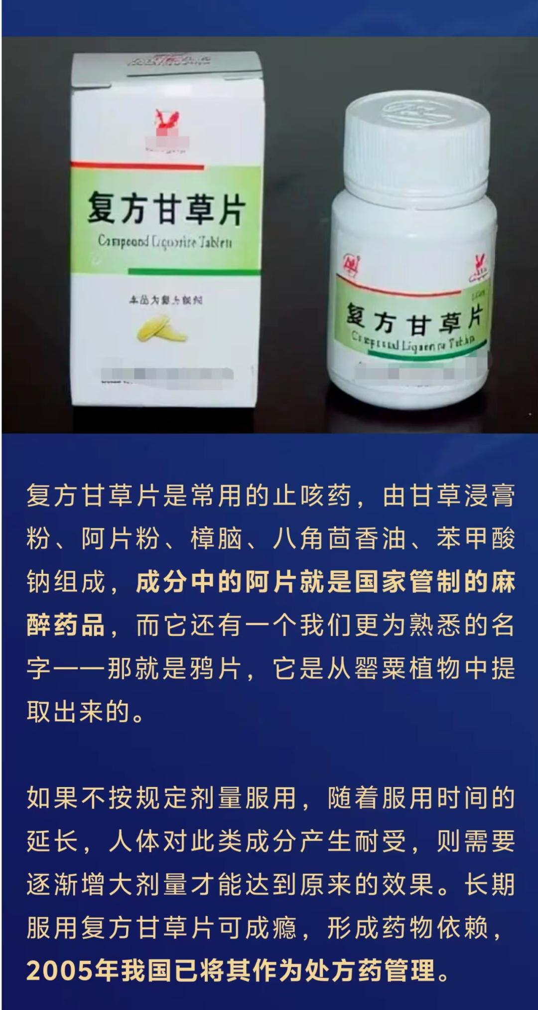 复方甘草片成分中的阿片是国家管制的麻醉药品,阿片是从罂粟里提取出来的,长期服用会形成药物依赖。