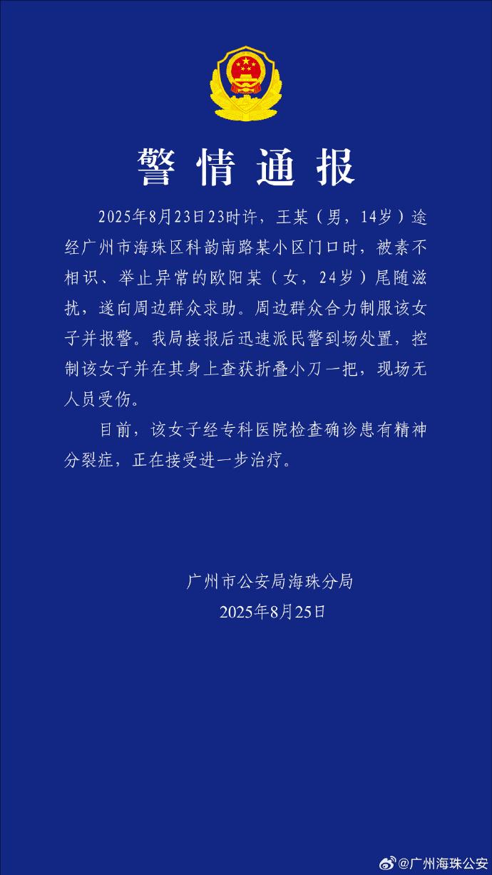 通报称,2025年8月23日23时许,王某(男,14岁)途经广州市海珠区科韵南路某小区门口时,被素不相识、举止异常的欧阳某(女,24岁)尾随滋扰,遂向周边群众求助。周边群众合力制服该女子并报警。广州市公安局海珠分局接报后迅速派民警到场处置,控制该女子并在其身上查获折叠小刀一把,现场无人员受伤。