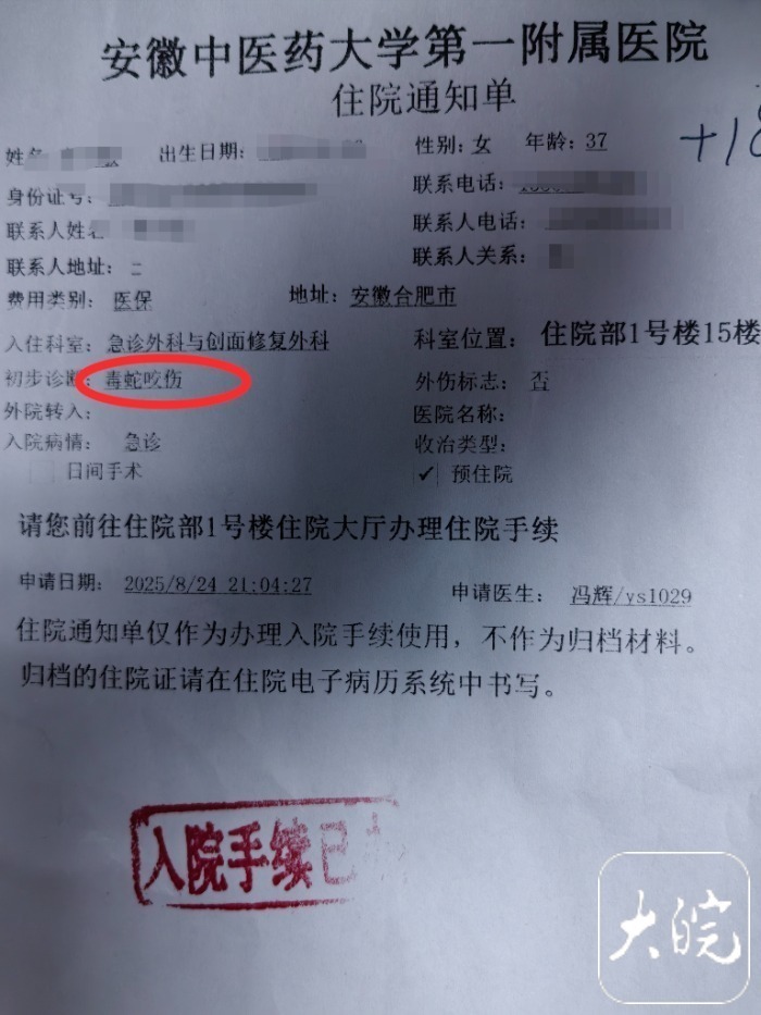 8月25日下午,合肥市野生动物保护协会理事虞磊告诉大皖新闻记者,他今天也在社交平台关注到此事,“图片中的伤口是两个洞,出血型,是非常典型的毒蛇咬伤。在合肥市分布的剧毒蛇目前只有一种短尾蝮,因此可以基本确定女子是被短尾蝮咬伤。”