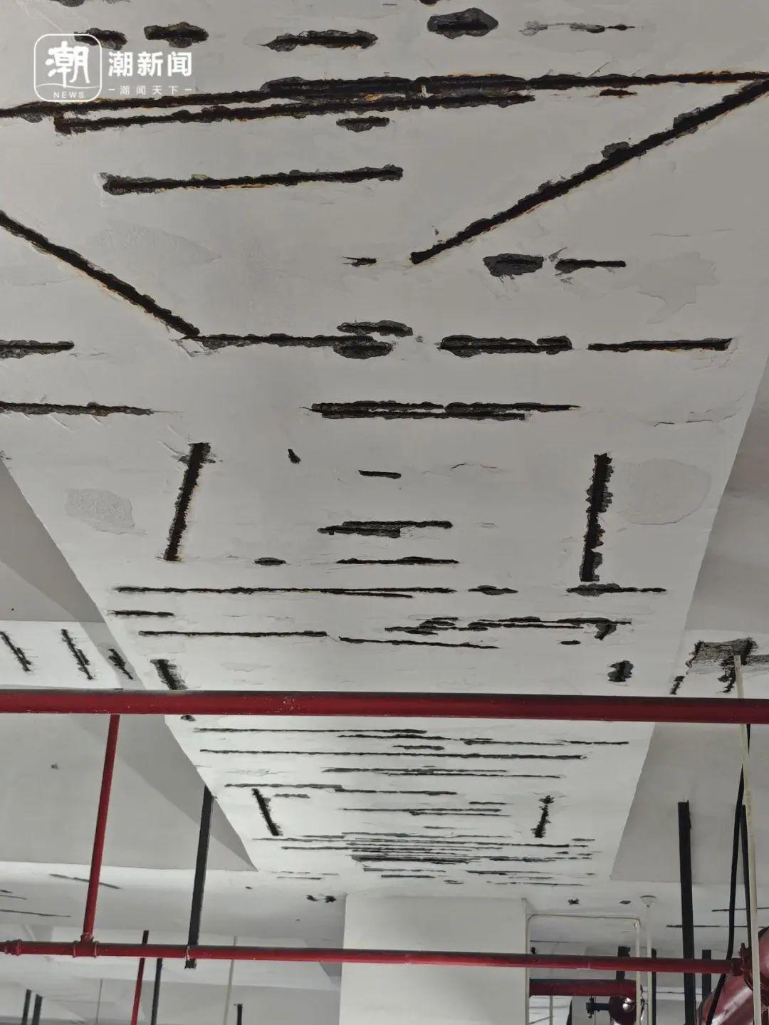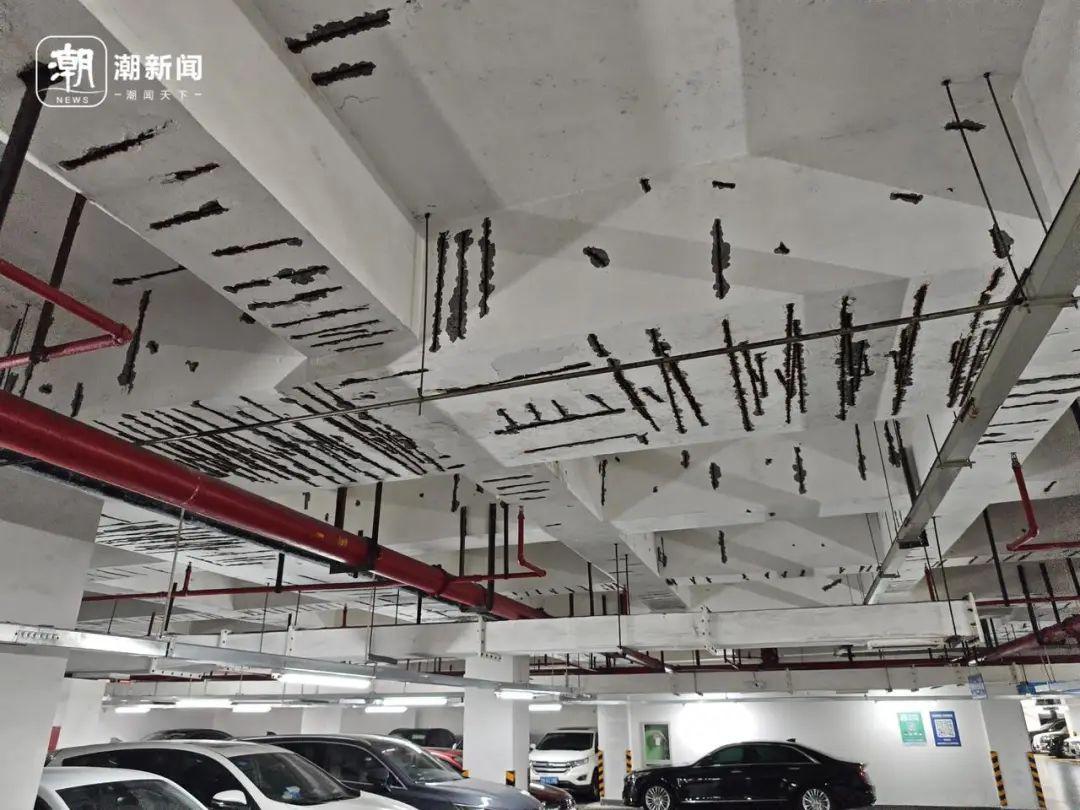 一走进停车场,就能看到顶部密密麻麻的“伤痕”。仔细看去,可以明显看到裸露的钢筋,周围是一圈剥落的外墙皮。