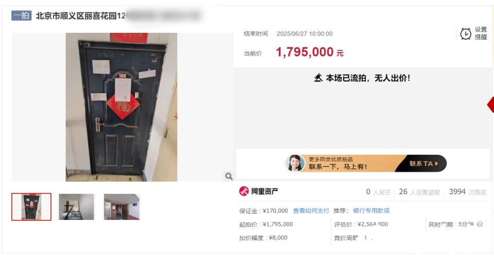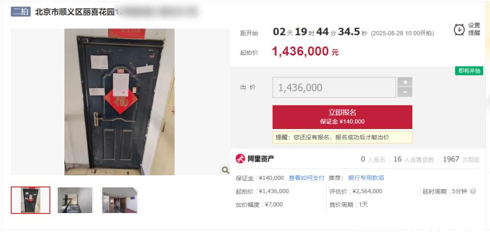 8月25日,记者在阿里资产拍卖平台上看到,位于北京市顺义区的一套商品房,原房主在家中跳楼身亡,房屋将于8月28日上午迎来第二次司法拍卖。该商品房的评估价为256.4万元,第一次拍卖的起拍价为179.5万元,因无人报名而流拍。此次是第二次拍卖,起拍价为143.6万元,比上一次降低了近36万元。截至记者发稿前,尚未有人报名参加拍卖。