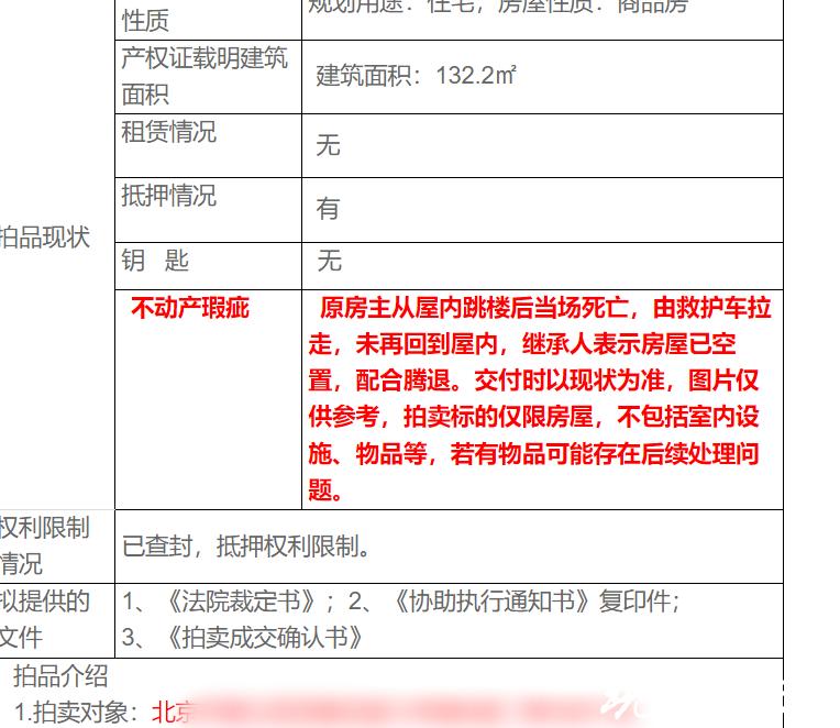 页面以显著红字作出瑕疵说明:原房主从屋内跳楼后当场死亡,由救护车拉走,未再回到屋内,继承人表示房屋已空置,配合腾退。交付时以现状为准,图片仅供参考,拍卖标的仅限房屋,不包括室内设施、物品等,若有物品可能存在后续处理问题。