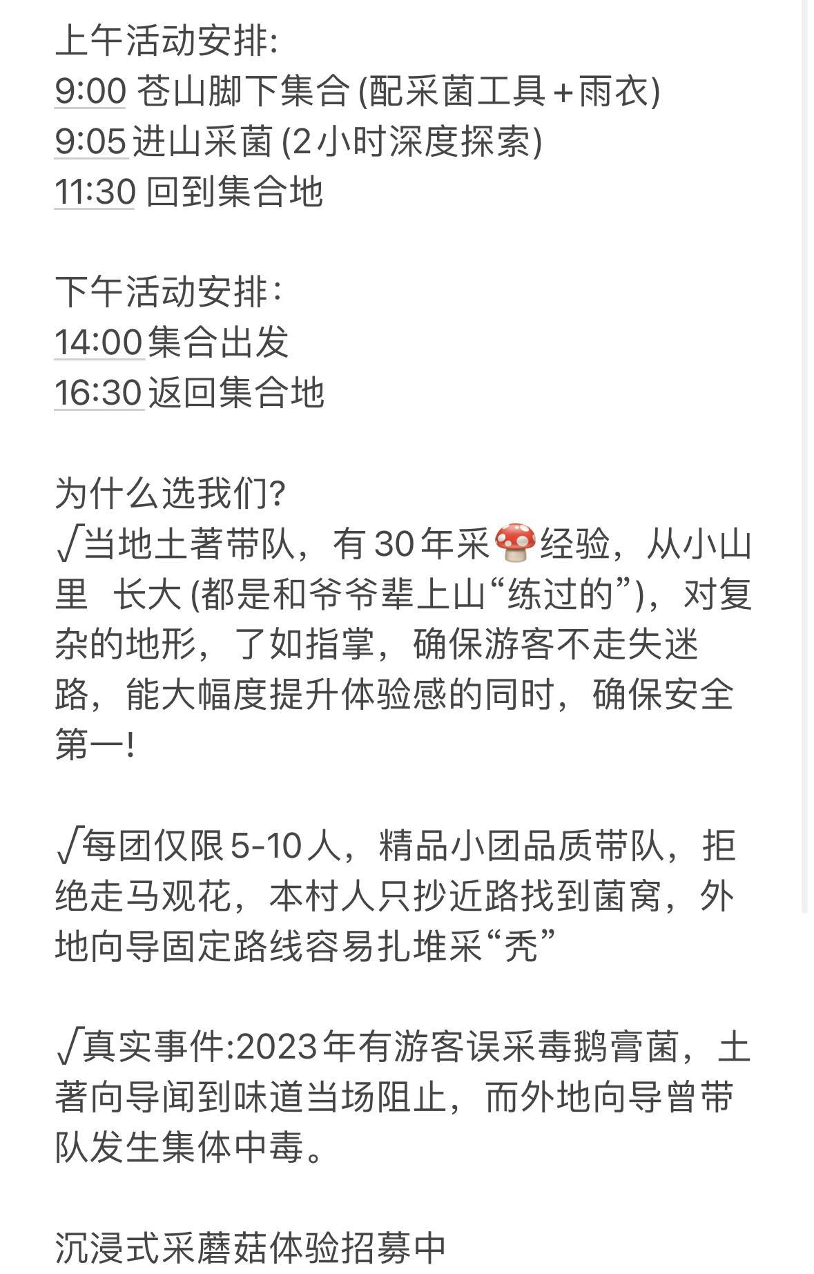 另一位发帖者向记者发来宣传单,包含88元至268元的三种套餐,称路途不会有危险,是当地人带队,已经带队5年。记者提出,苍山现在加强管理,进山是否违规?发帖者回复表示,“采蘑菇都是在浅山区采的,不去核心区域。”