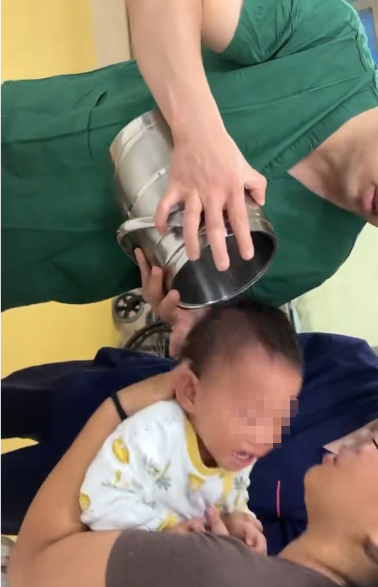 现场视频为证,孩子声嘶力竭地大哭,家长抱着不断地安慰,最终周医生成功地将保温饭桶从孩子脑袋上拔下。