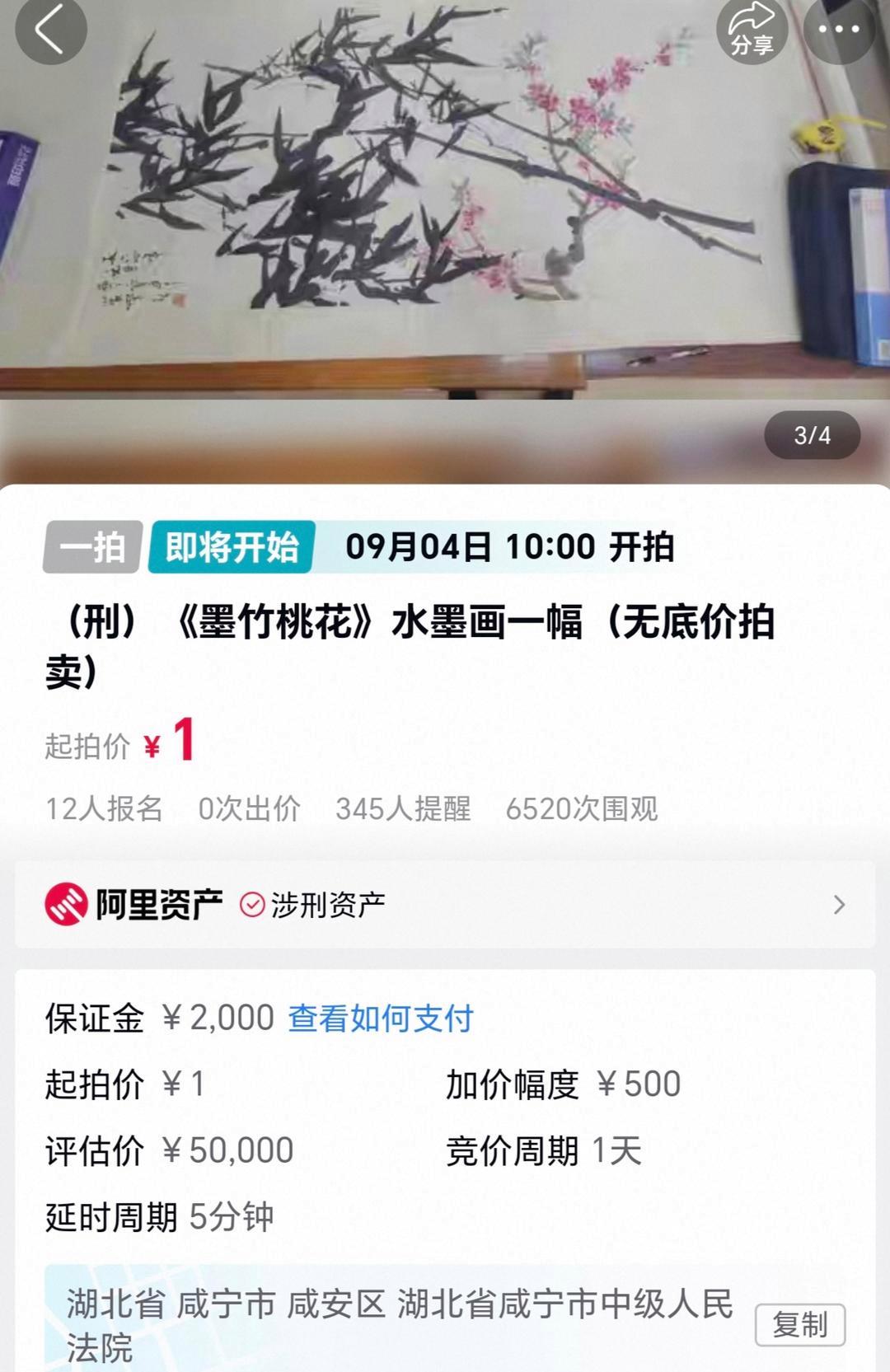 8月26日,红星新闻记者从阿里司法拍卖平台获悉,湖北省咸宁市中级人民法院将于9月4日对一幅名为《墨竹桃花》的水墨画作品以1元的起拍价进行司法拍卖。拍卖平台信息显示,该“标的物”系涉刑资产无底价拍卖。