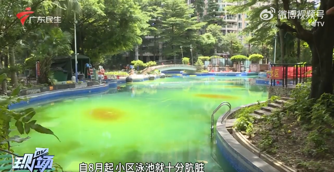 近日,广州番禺锦绣生态园业主反映,自8月起,小区泳池就十分肮脏,不仅有很多树叶,水质还很浑浊,青苔非常明显。