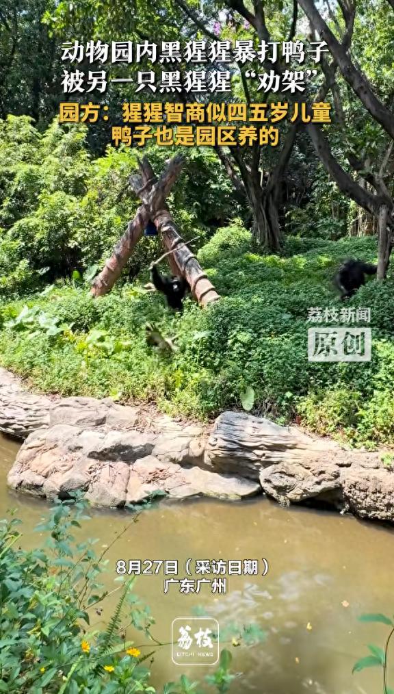 8月27日,园方回应称,鸭子为园区所饲养,若发现猩猩打鸭子会现场处理。园方表示,黑猩猩智商接近人类五六岁儿童,行为多出于好奇或调皮,种群管理由专业部门负责。