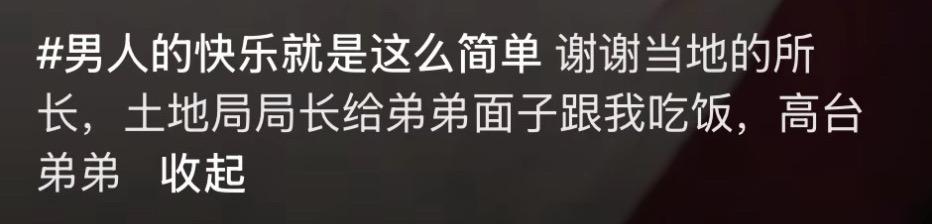 8月19日,有网民在社交平台发布视频,视频中他与五人在桌上吃饭,桌上有一瓶酒,他还配文“#男人的快乐就是这么简单 谢谢当地的所长,土地局局长给弟弟面子跟我吃饭,高台弟弟”。