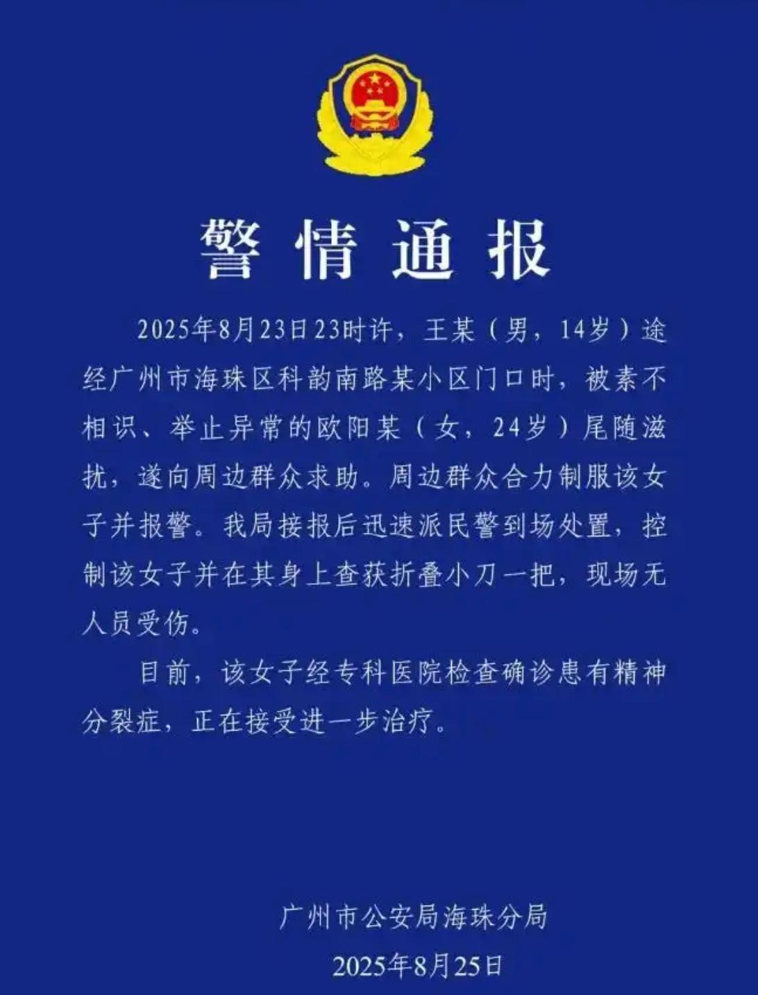 8月25日18时45分许,广东省广州市公安局海珠分局发布通报称,涉事女子被当场控制,为精神分裂症患者,已送医治疗,现场无人员受伤。