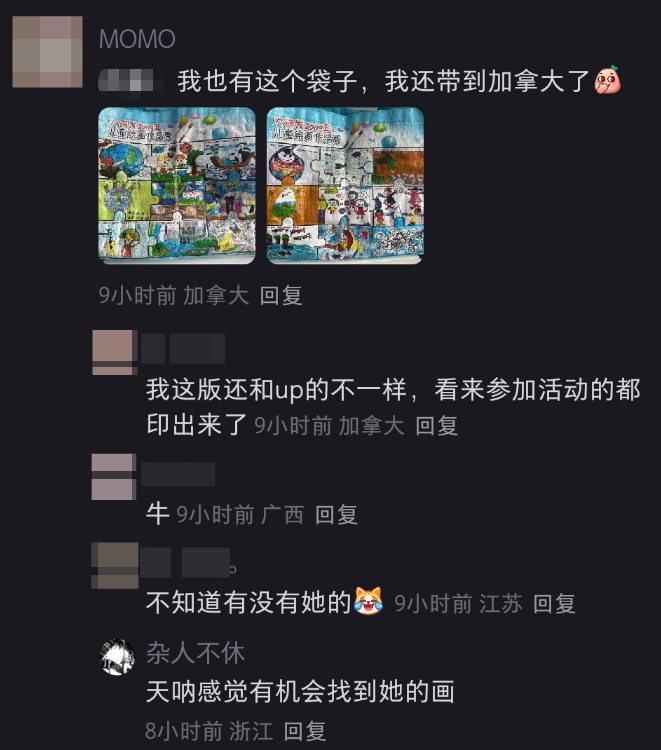 她回忆道,妈妈当年曾带她参加过那场比赛,她还获得了三等奖。尽管最终她的画作并未被印在当年的环保袋上,但16年后突然与这个记忆的载体重逢,“仿佛一瞬间回到了小时候”。她写道:“我一边打字,一边在地铁上暴哭。”这段经历触动了许多网友。有网友表示,这就是所谓“童年的纸飞机,现在终于飞回我手里”。还有一位网友提到,自己也找到了当年比赛的同款环保袋,并表示该环保袋可能有多个版本,也许发布者的作品也曾被选印在某版的袋子上。