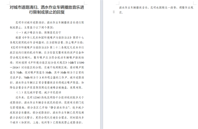 其中说,这主要是基于以下原因:一是减少噪音污染,保障居民安宁。根据《中华人民共和国环境噪声污染防治法》第四十七条规定,使用机动车音响器材,应当控制音量,防止噪声污染;《昆明市环境噪声污染防治法》第二十二条规定,凡在本市行政区划内行驶的机动车辆,应当安装完整有效的消声设备和符合规定的喇叭,整车噪声应当符合机动车辆噪声排放标准;同时按照《声环境功能区划分技术规范》(GB/T 15190—2014)对功能区的分级,交通干线两侧区域,昼间噪声限值为70db,夜间噪声限值为50db,其中50db相当于正常的交谈声音,70db相当于3米外吸尘器的工作声。城市道路清扫、洒水作业车辆以正常音量播放音乐,将超出噪声限值,如降低音量,音乐声很容易因周边交通噪音被掩盖,效果有限。