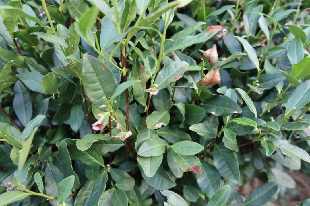 8月26日下午四点,西湖区转塘街道上城埭村的茶园,部分龙井茶确实出现少量叶片变色、枯焦、脱落的现象。