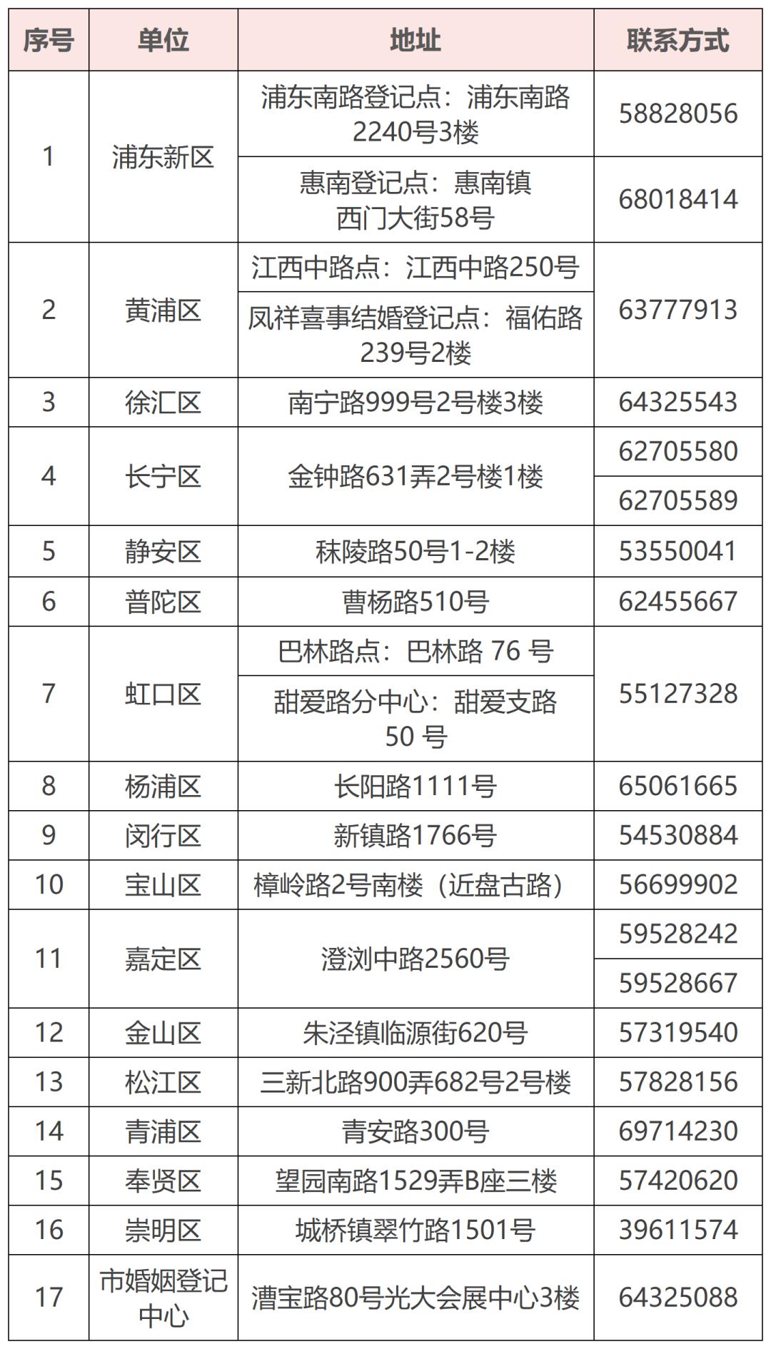 上海市婚姻登记机构一览表