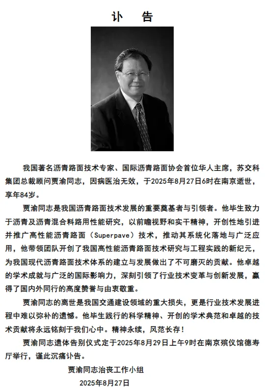 我国著名沥青路面技术专家、国际沥青路面协会首位华人主席,苏交科集团总裁顾问贾渝同志,因病医治无效,于2025年8月27日6时在南京逝世,享年84岁。