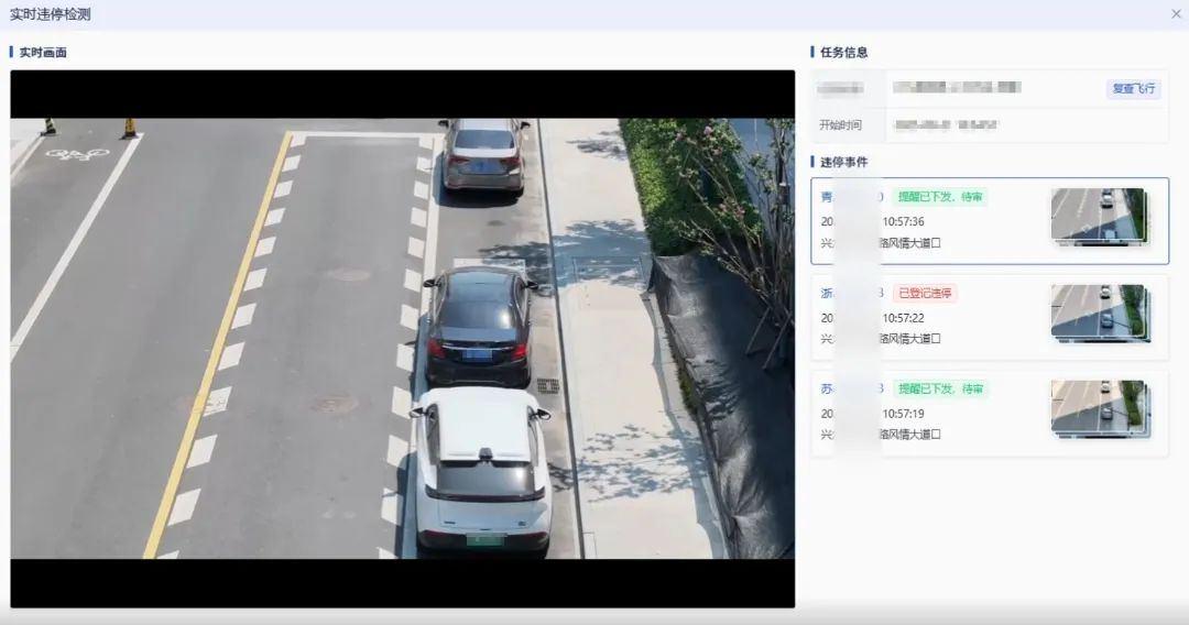 系统预设巡检航线,无人机根据计划自动执行日常巡飞任务。在巡检过程中,自动识别并抓拍违停车辆,同时将证据信息上传非现场执法系统。对于非严管路段被抓拍的违停车辆,系统自动短信提醒劝离,十分钟后无人机自动复飞巡检,对仍未驶离的车辆进行二次取证,上传系统处罚,完成执法闭环;严管路段抓拍的违停车辆,经审核后将予以处罚。这整个流程,即为无人机非现场查处违停违法的过程,全程自动完成,数据实时传输。