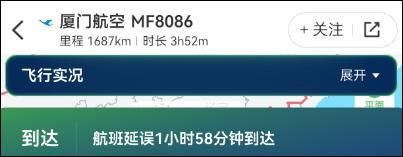 从航旅纵横上查询到,该航班延误了1小时58分。