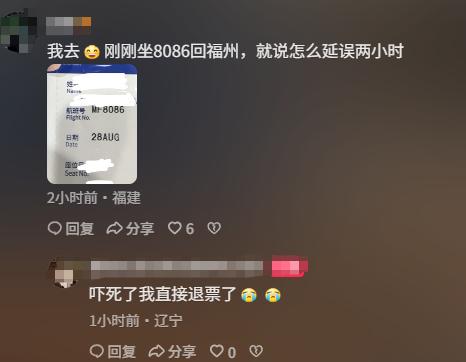有网友在该发帖博主下留言,称延误了两个小时,原博主回复“已退票”。