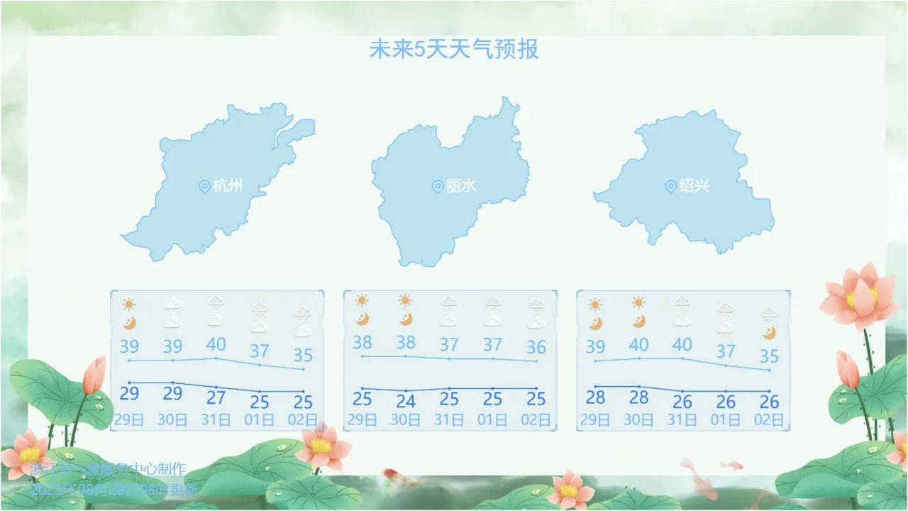 今明(8月29-30日),副热带高压加强控制浙江,将带来两个影响:一是午后雷阵雨条件不佳;二是高温强度冲顶,最高可达39-40℃。