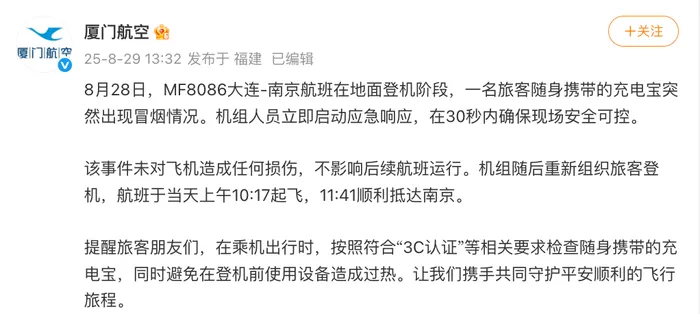 厦门航空8月29日发布情况通报:8月28日,MF8086大连-南京航班在地面登机阶段,一名旅客随身携带的充电宝突然出现冒烟情况。机组人员立即启动应急响应,在30秒内确保现场安全可控。该事件未对飞机造成任何损伤,不影响后续航班运行。机组随后重新组织旅客登机,航班于当天上午10:17起飞,11:41顺利抵达南京。