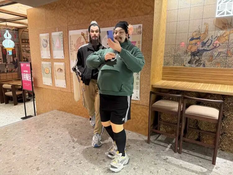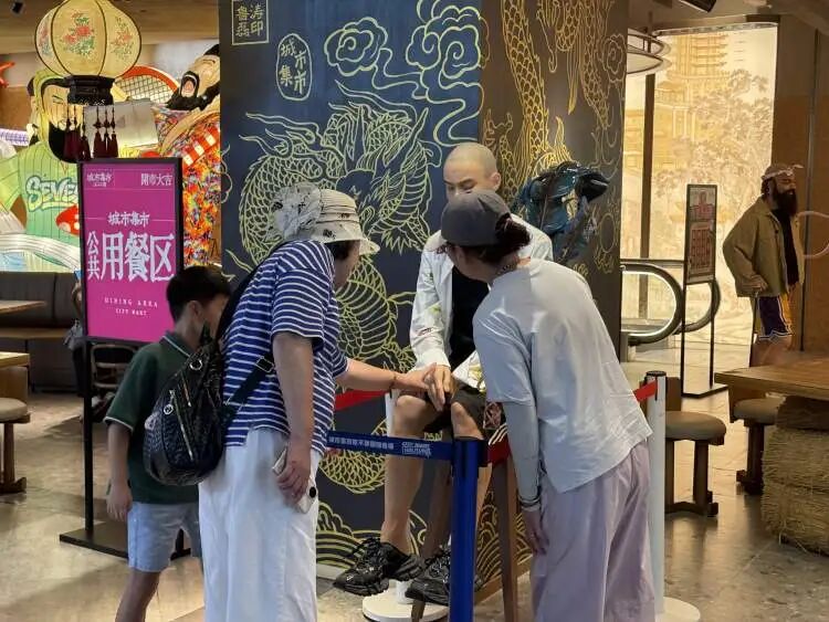 这种审美分裂在“城市集市・江南”B1层的空间内随处可见,端着笔记本电脑、弹着电吉他的“赛博八仙”和穿着潮牌服饰的各色蜡像就是引发争议的源头。特别是集市入口处的那尊蜡像肤色纹理细腻,睫毛根根分明,就连手部关节、青筋都清晰可见。不少人还以为这是活人在做人体艺术,感觉它下一秒就要睁开眼了。