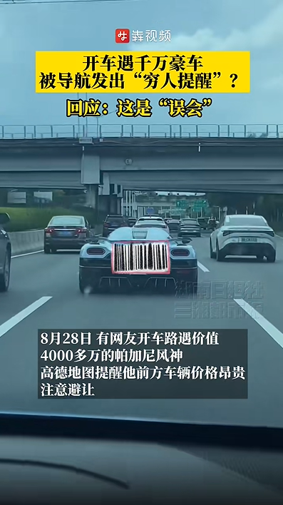8月28日,有网友发布视频称,开车路遇价值4000多万的帕加尼风神,高德地图提醒他前方车辆价格昂贵,注意避让。视频一经发出,很多网友“破防”称“高德不但贴心,还懂扎心”。