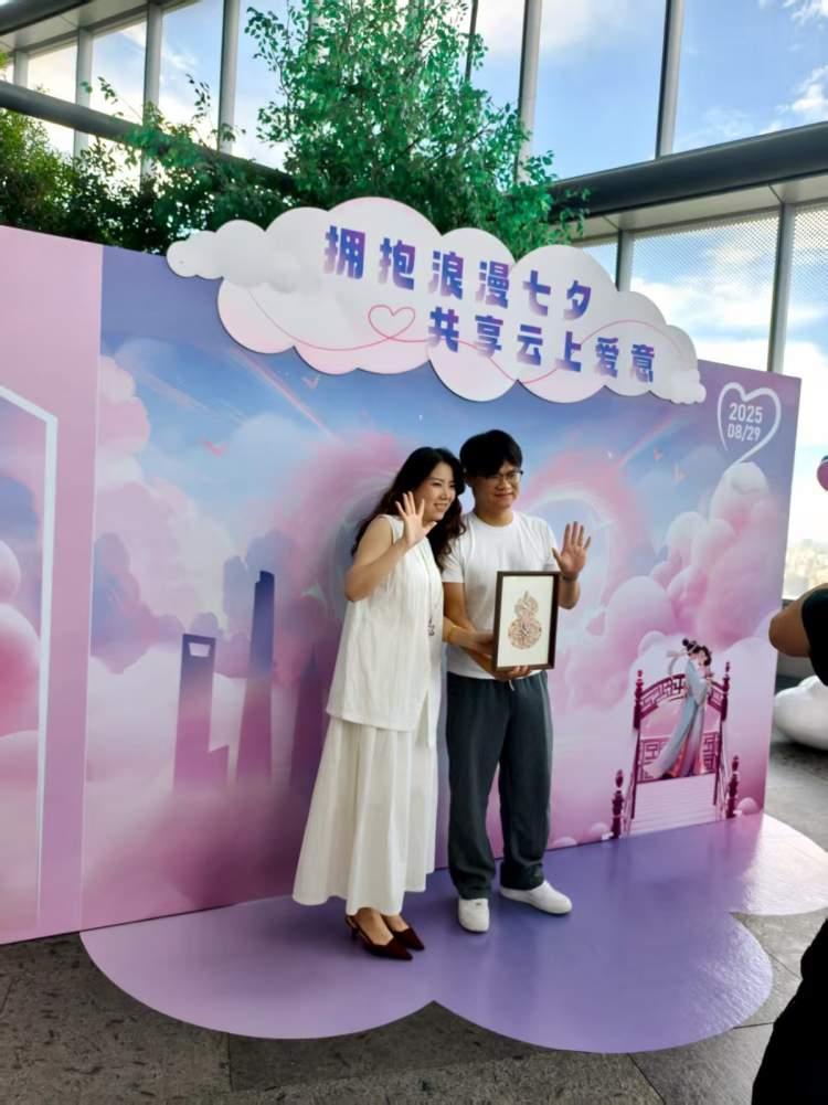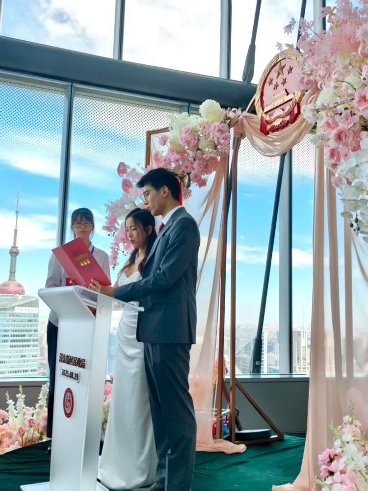 刘先生和韩小姐告诉记者,他们特意选在七夕这个传统节日登记,为婚姻增添一份独特的浪漫寓意。“我俩都是新上海人,从静安过来的。以前很喜欢从浦西眺望浦东,欣赏陆家嘴三件套的风采,但没想到能在上海中心大厦结婚。上海给了我们这样的机会,真是太棒了。”