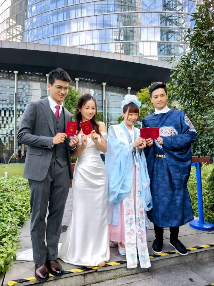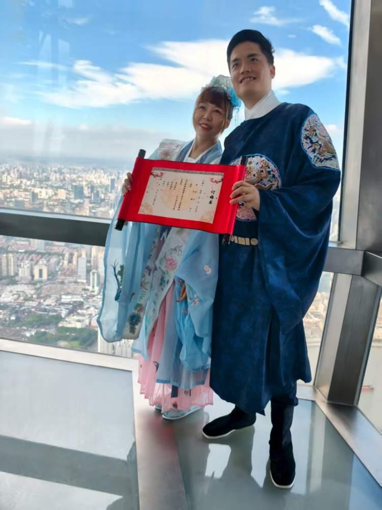 一身蓝色汉服的新郎熊先生告诉记者,他从手机上刷到了浦东新区民政局携手上海中心大厦打造的“上海中心婚姻登记点”8月8日试运行的消息,觉得非常浪漫,就联系浦东新区民政局进行了咨询。得知8月29日七夕当天还有“云端领证”的机会,他就去“随申办”上预约了。“现场体验感觉非常好,很有特色,特别是在上海中心,这也是上海的著名地标,对我们来说很有纪念意义。”