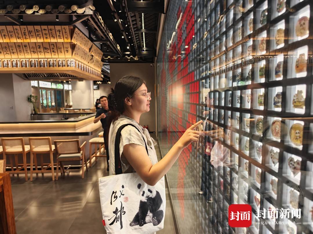 在这个1000多平方米的空间里,宽窄熊猫不仅仅是一个餐饮空间,更是一个以原创熊猫IP为核心,融合成都小吃、四川非遗美食、文创伴手礼的新消费场景。食客既能品尝到来自大熊猫故乡雅安的百年非遗“荥经周仕英棒棒鸡”,也能体验汉源贡椒抄手、宜宾燃面等四川各地特色小吃。墙上的宽窄成都礼物展示柜里,陈列着获得红点设计大奖、德国设计奖等数十个国际大奖的文创产品。这些产品曾作为城市礼物,送给美国、意大利、瑞典等数十个友好城市,并为G20、世界大运会等国际盛会提供服务。