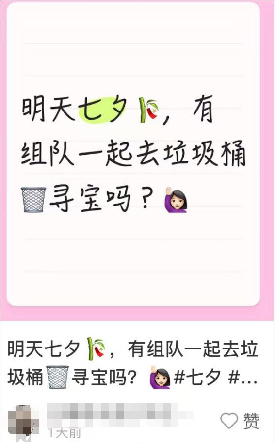 社交平台上有网友制作并分享了杭州的“捡垃圾攻略”,甚至约定组团在七夕夜间前往商场、高档小区附近的垃圾桶周边“蹲点”,希望捡到被丢弃的鲜花、蛋糕、饰品甚至贵重礼物。