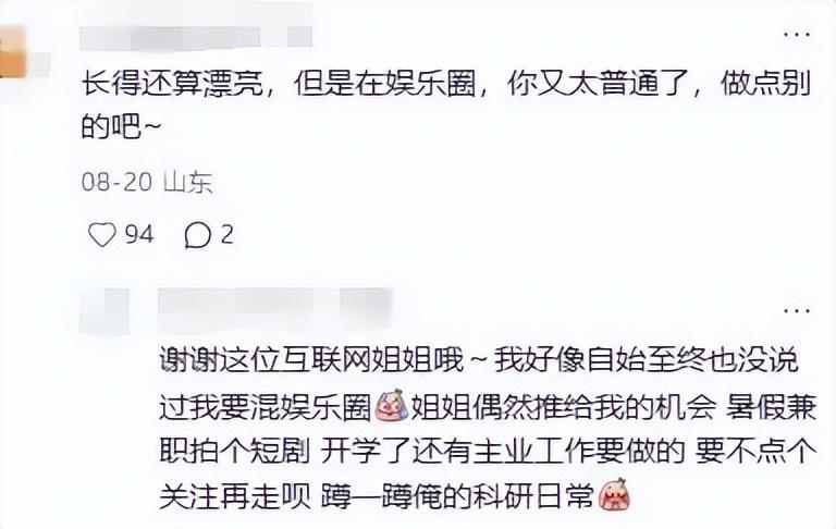 她谈笑回应,是演得不够好吗?读书让每个人有了更多的选择权,从事的职业不因学历而设限。三百六十行,行行有“门道”。接触短剧行业后,发现有更多需要学习的。拍短剧缓解了焦虑。当然,只是暑假兼个职,开学照样搞科研的。但未来或许做短剧制片、投资人,甚至加码XR/VR科技,让短剧更精品、更沉浸。